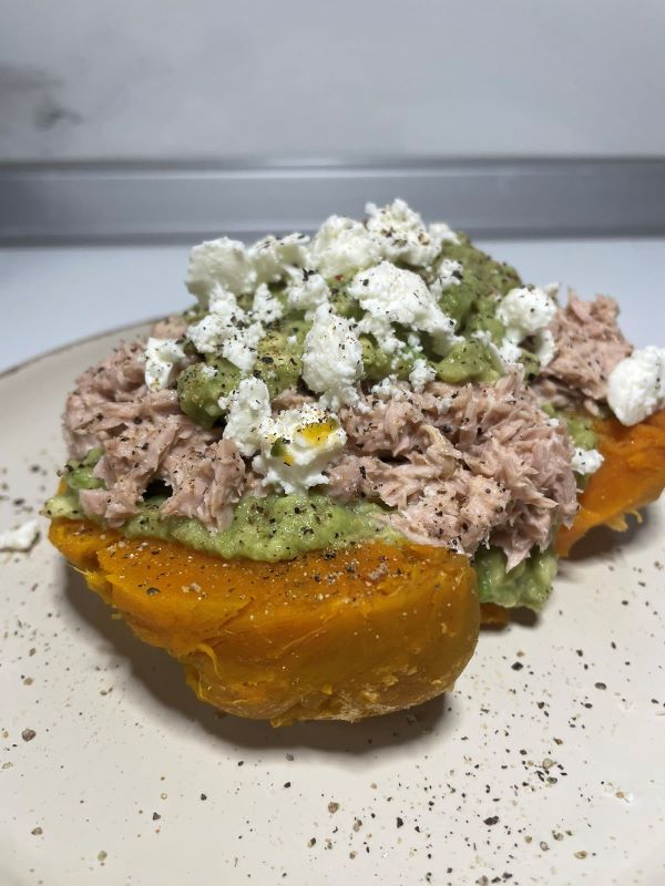 5️⃣ Προσθέτεις πάνω απο την γλυκοπατάτα τη μισή ποσότητα αβοκάντο, βάζεις το μίγμα με τον τόνο και ξανά αβοκάντο.