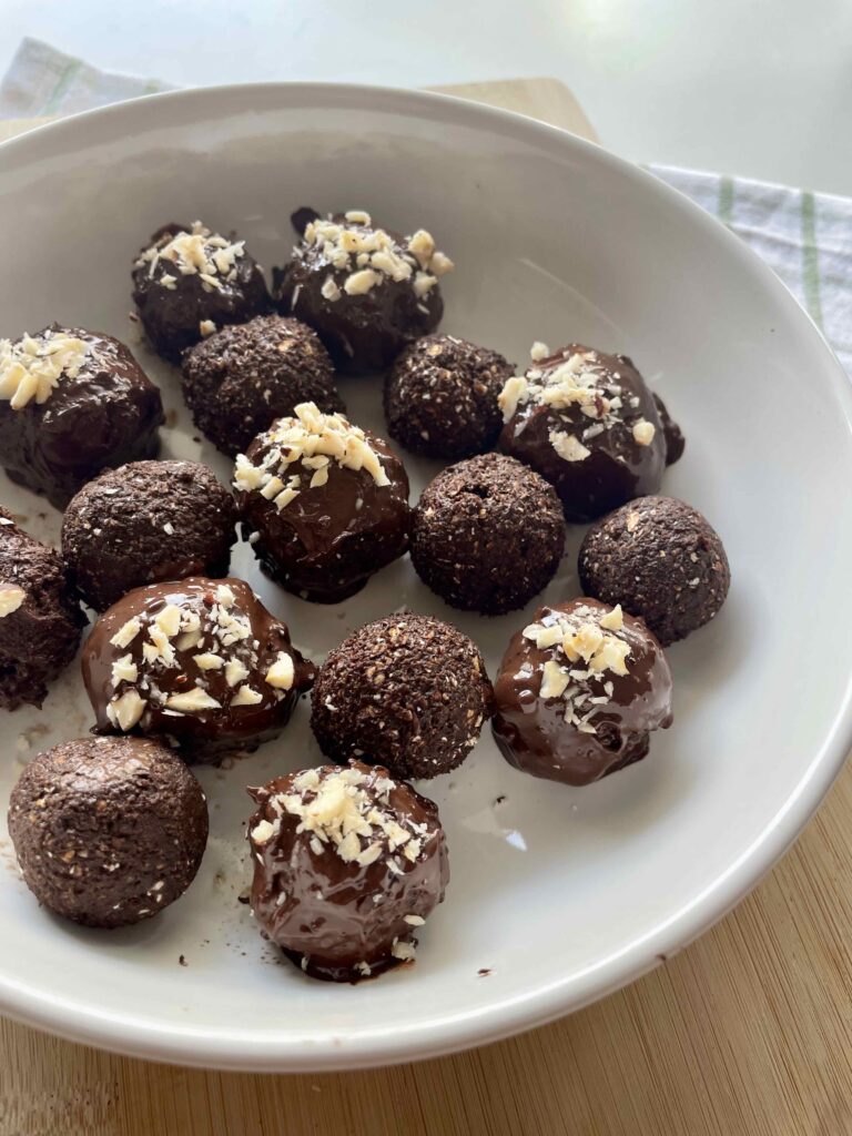 3️⃣Λιώνουμε την κουβερτούρα, βουτάμε τα μπαλάκια, πασπαλίζουμε με τριμμένο φουντούκι και αφήνουμε στο ψυγείο μέχρι να σφίξει η σοκολάτα